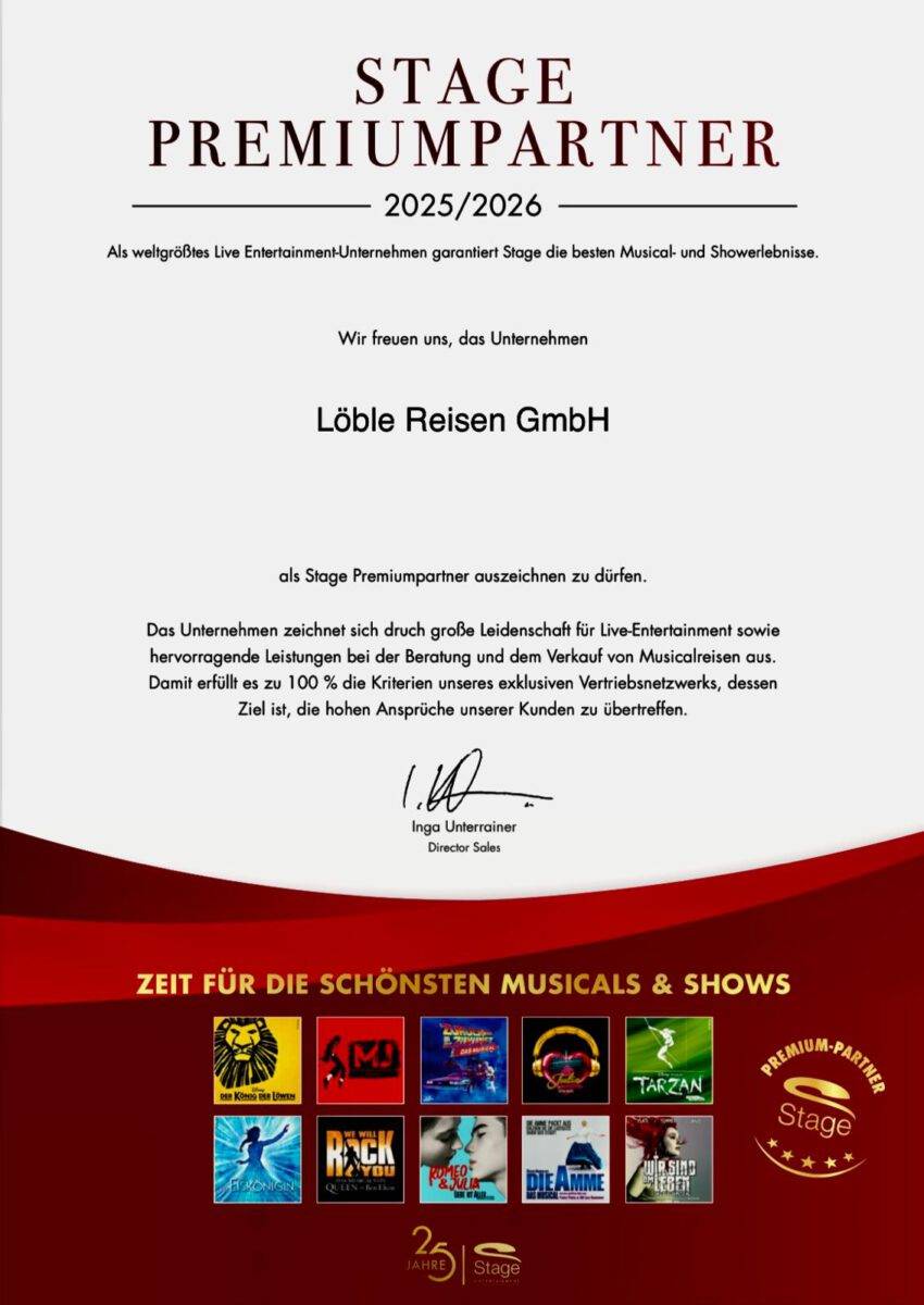 Liebe Musicalbegeisterte, wir freuen uns sehr darüber euch mitteilen zu können, dass wir für das Jahr 2025/2026 von Stage Entertainment als Premium Partner ausgezeichnet wurden.