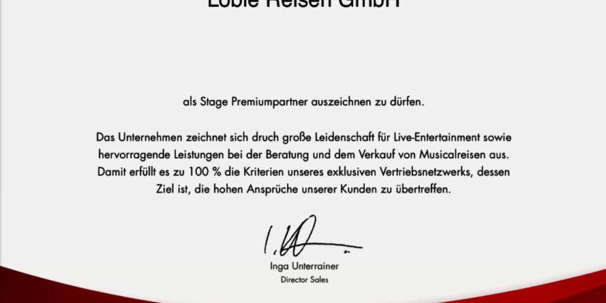 wir freuen uns sehr darüber euch mitteilen zu können, dass wir für das Jahr 2025/2026 von Stage Entertainment als Premium Partner ausgezeichnet wurden.